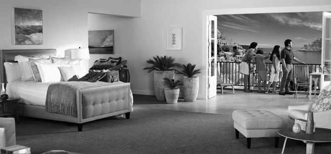 A family on vacation enjoys the view from their hotel room in the Greek Islands. The view from the balcony added in post production. A blue credit card slides across the frame to reveal the black and white imagery.