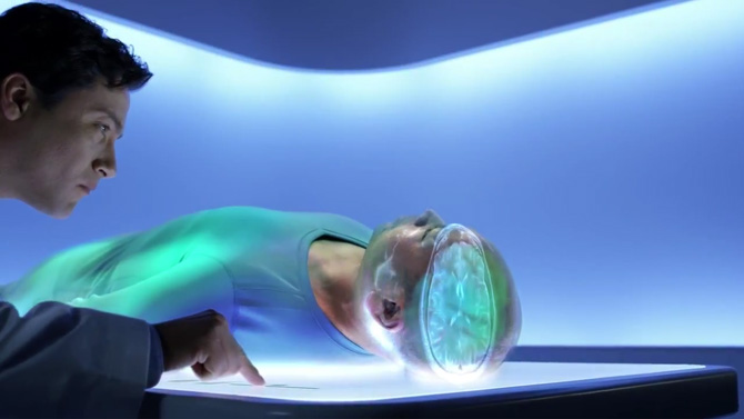 Our surgeon examens the patient's holographic brain. All set elements are actual. Custom table made with 3/8" illuminated surface material. Image©Rough House