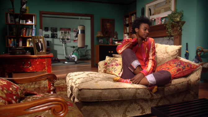A young woman watches TV in this London set.