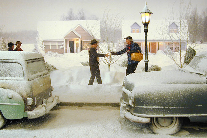 Foreground set elements and snow effects merge with a 65' wide custom translight to create a wintry holiday mood. Image©Sterling Storm