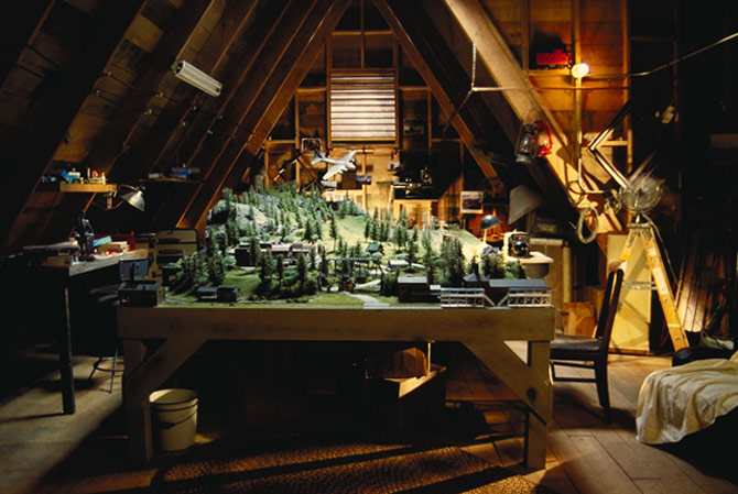 Attic for a "stop action" animation spot. The model train setup on the platform is one of a variety of miniature sets in this commercial. Images©Sterling Storm