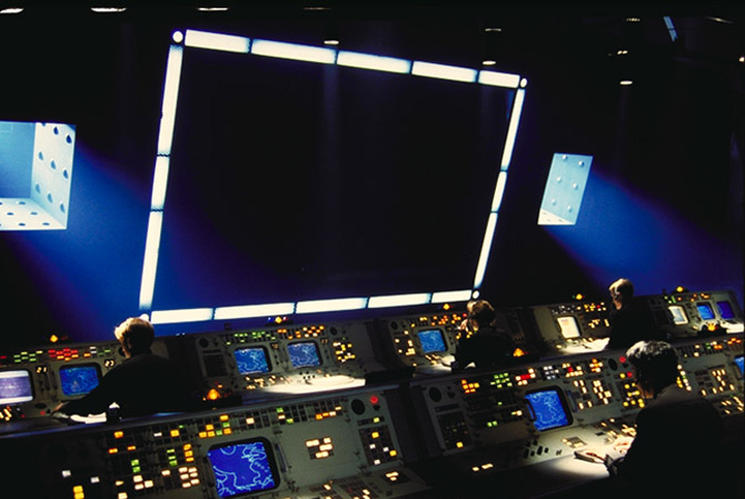 War room bunker. Windows created by flagging off hanging boxes. Incoming missile graphics keyed in big screen in post. The world blows up. Images©Sterling Storm