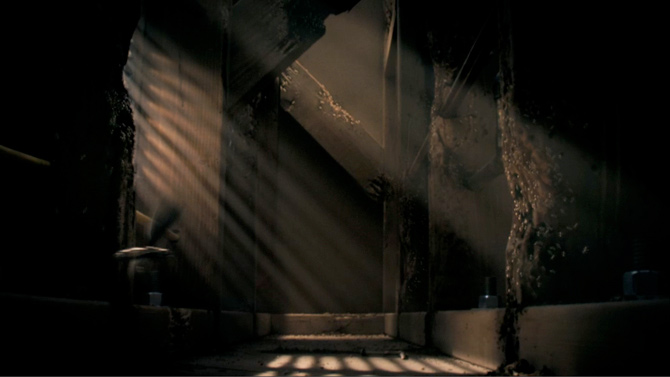 Interior wall set with termite damage - built to actual scale for motion control camera. CG termites added in post. Image©The Orphanage